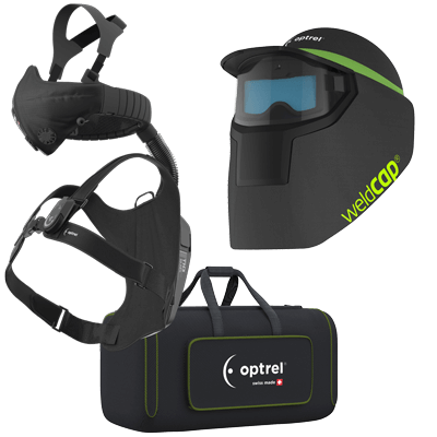 “Ready to weld package weldcap + swiss air respiratory protection system complete with control panel, incl. comfort half mask: consisting of half mask and hose system incl. head and neck strap, blower unit, shoulder harness, charger, storage bag”